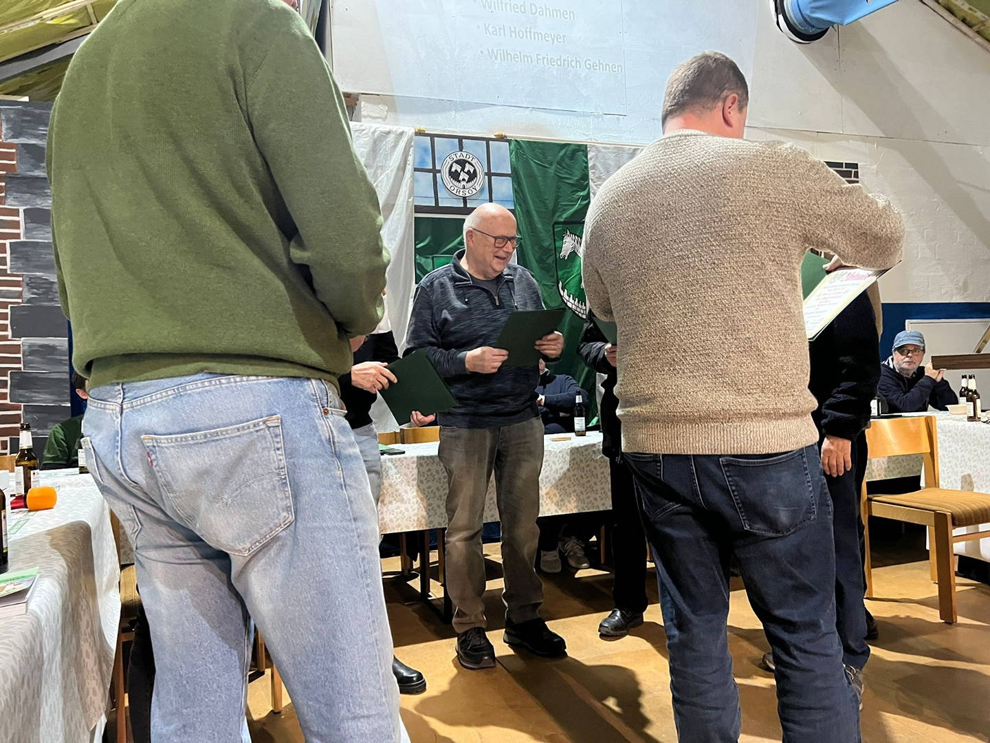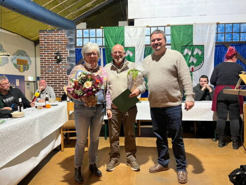 Präsident Andreas Blumenstengel bedankte sich bei dem ausgeschiedenen Vorstandsmitglied Jürgen Diebels für seine geleistete Arbeit. Viele Teile und Splitter seiner Vögel die er die letzten Jahre in liebevoller Handarbeit erstellt hat stehen, hängen oder liegen in den Wohnzimmern vieler Orsoyer.